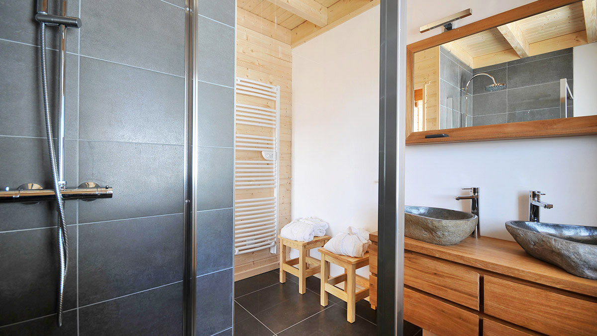 - Au rez-de-jardin, la chambre GENTIANE, orientée plein sud avec balcon, d’une surface de 22 m2, dispose d’un grand lit double (160 x 200 cm). Sdb : vaste douche à l’italienne, lavabo double vasque et toilettes séparées.
