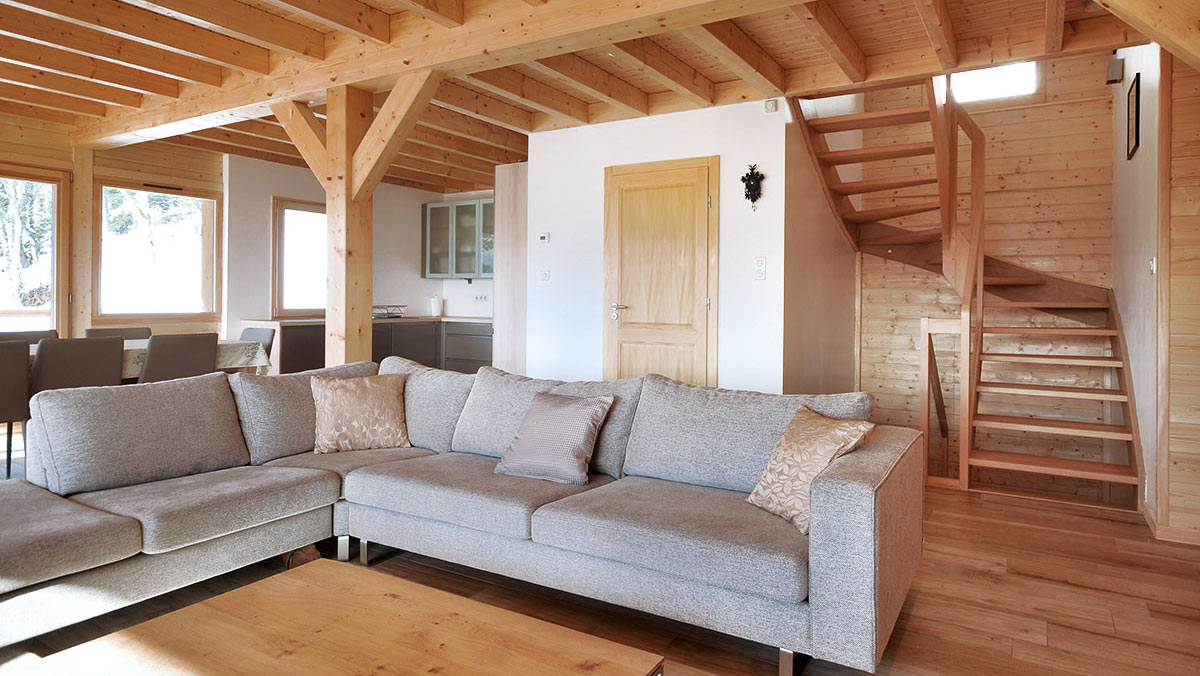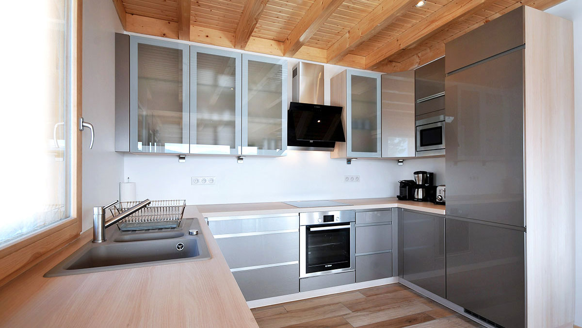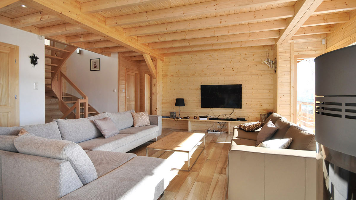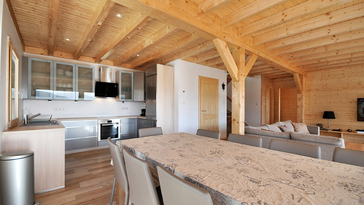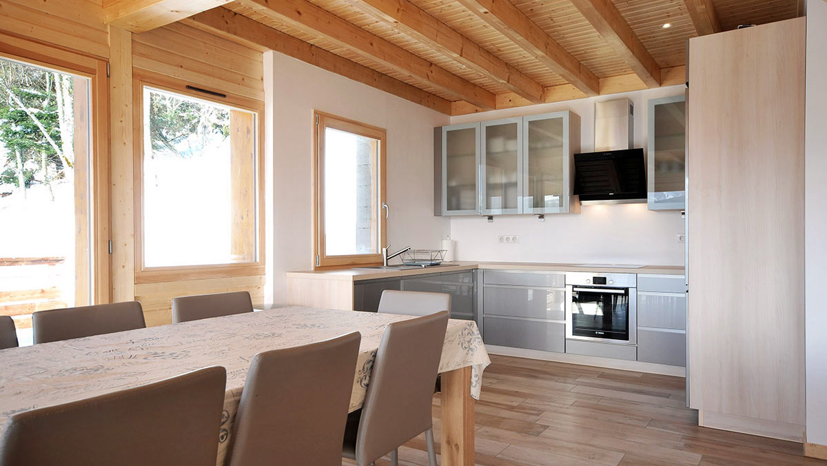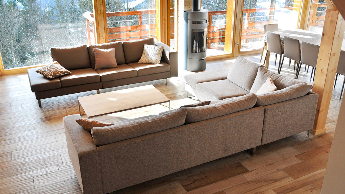 Le salon-séjour, constitue un grand espace d’une surface de 50 m2 ouvert sur une cuisine américaine toute équipée. Autour du feu de bois crépitant dans le poêle scandinave, confortablement installées dans les grands canapés douillets, autour d’un verre, vous appréciez le spectacle d’une nature grandiose qui s’offre à vous aux travers des baies vitrées. En famille ou entre amis, vous partagez l’intimité d’un refuge de montagne, la convivialité authentique et l’ambiance unique d’un lieu vrai où la nature omniprésente s’allie au luxe et au confort pour vous enchanter à tout instant.